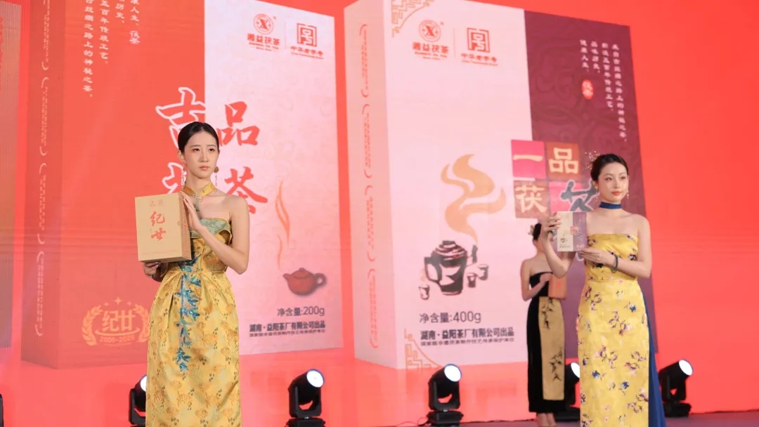 在發(fā)布儀式上,與會領導和專家共同啟動推桿,隨著金沙傾瀉而下,"紀廿"新品正式亮相,象征著湘益茯茶開啟新的發(fā)展征程。隨后,一場別開生面的新品模特走秀吸引全場目光。身著典雅服飾的模特手捧"紀廿"新品,以優(yōu)雅的姿態(tài)展示這款傳承與創(chuàng)新相結合的茯茶珍品,傳統(tǒng)茶文化與現(xiàn)代時尚在此完美交融,凸顯出新品的獨特魅力。